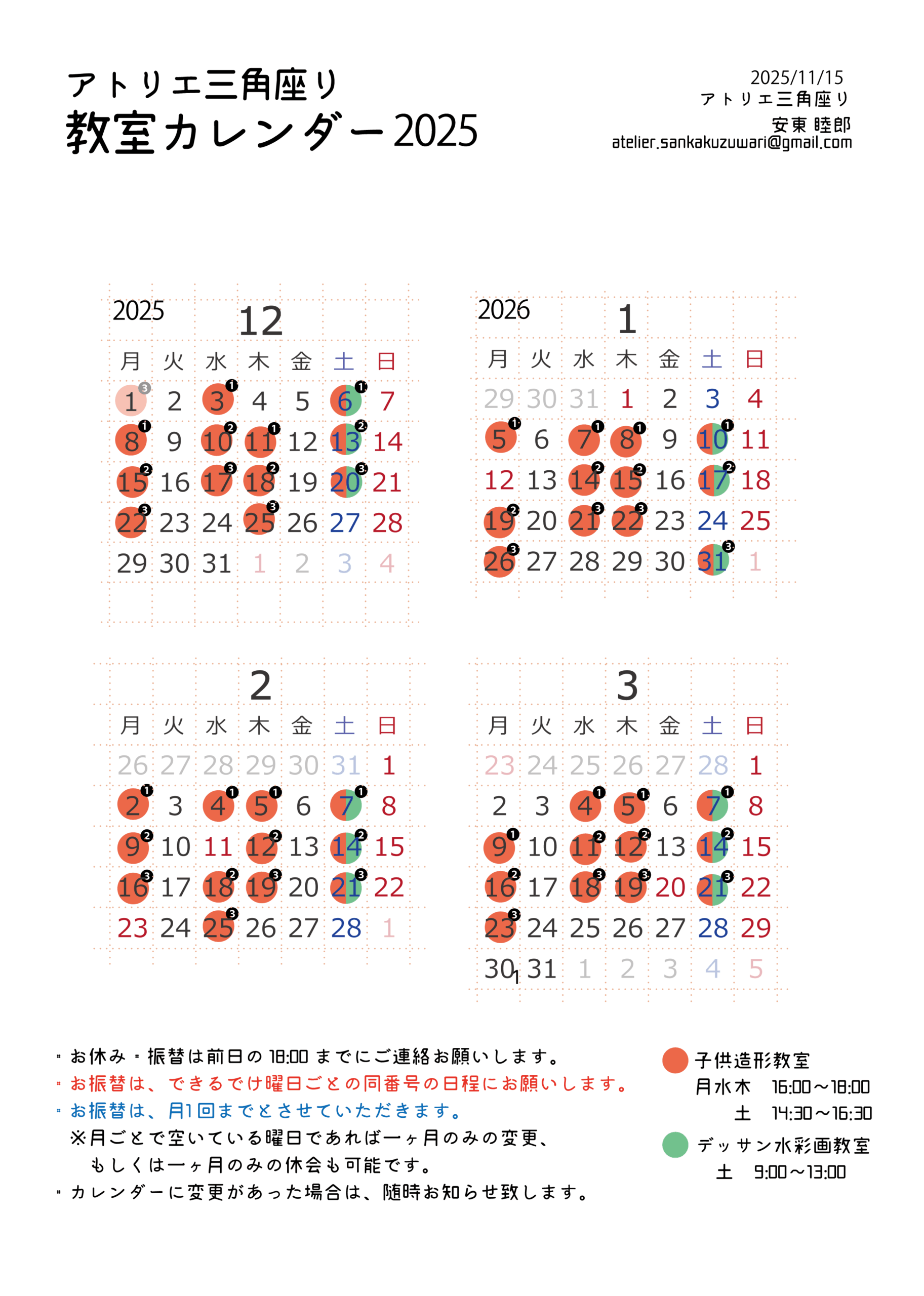 2025.11.15 授業カレンダーを更新しました。 2025年11月15日 最終更新日時 : 2025年11月15日 三角座り 2026年12月~2026年3月の授業カレンダーです。 今年もあとわずかです。気づいたらいつの間にか新年を迎えるのでしょうね。